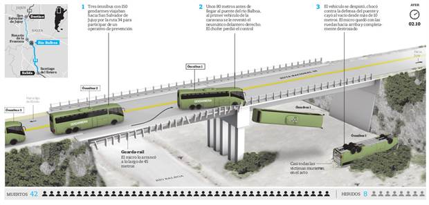 El titular de Defensa Civil de Salta, Francisco Marinaro Rodó, detalló a LA NACION que "el ómnibus reventó la cubierta varios metros antes del puente, chocó el guard-rail y, cuando faltaban pocos metros para superar la estructura, se tambaleó y cayó más de 10 metros hacia el río con las ruedas hacia arriba". El funcionario explicó: "Por la forma en que cayó el colectivo, de espaldas, todo el peso de más de 20 toneladas del vehículo aplastó completamente la cabina de los pasajeros, lo que provocó semejante cantidad de víctimas".